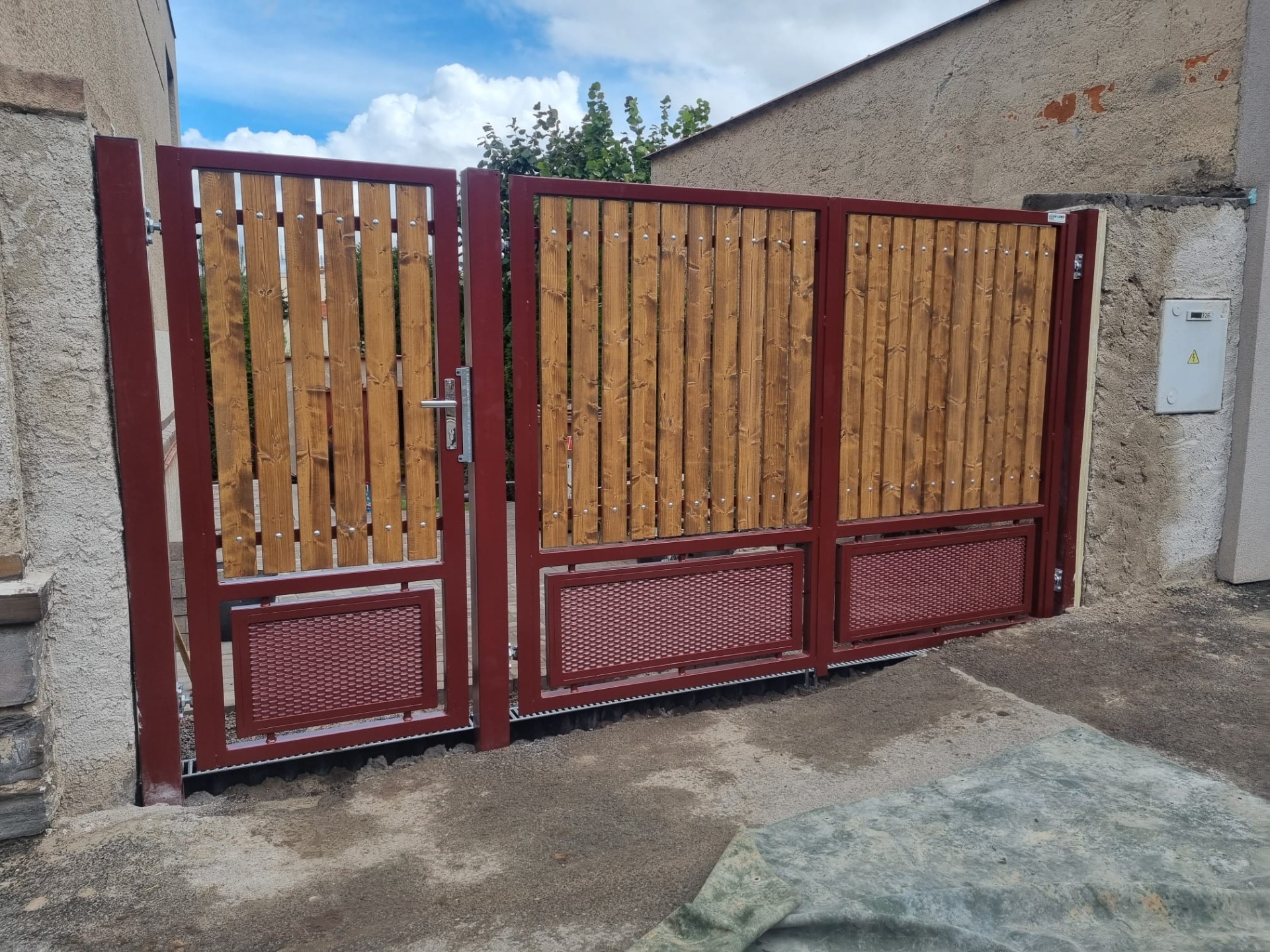 Samonosná brána s integrovanou brankou a plechovou výplní - Pečky.